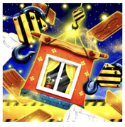 Deep space backgrounds filled with stars and golden sparkles create a cosmic construction site atmosphere. Yellow and black hazard stripes, glowing cyan borders, and 3D text effects combine industrial and magical themes. Every element from wooden tiles to multiplier badges features vibrant colors and particle effects.